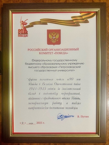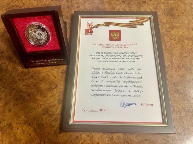 Медалью "80 лет Победы в Великой Отечественной войне 1941?1945 годов" награжден коллектив Петрозаводского государственного университета за значительный вклад в подготовку мероприятий, связанных с празднованием юбилея Победы, мемориальную работу, а также патриотическое воспитание молодёжи. Также университету вручен диплом за подписью Президента Российской Федерации Владимира Путина от российского организационного комитета "Победа".